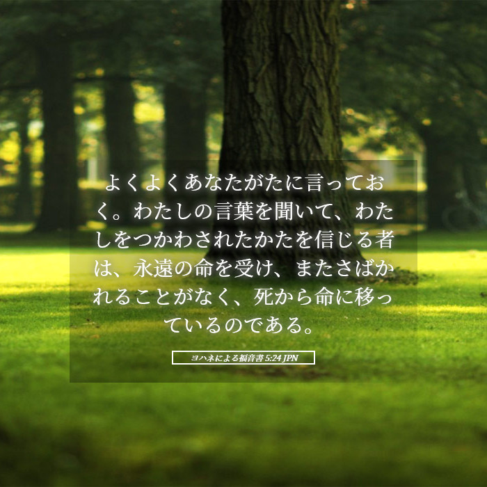 ヨハネの福音書 5:24 – 「まことに、まことに、あなたがたに言います。わたしのことばを聞いて、わたしを遣わした方を信じる者は、永遠のいのちを持ち、さばきに会うことがなく、死からいのちに移されました。」
