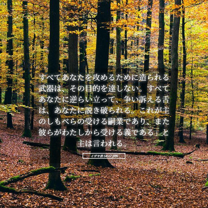 「あなたに対して作られる武器は、何ひとつ成功しない。あなたに向かって訴える舌は、すべて罪に定める。これが主のしもべたちのゆずりであり、彼らの義はわたしから出ると主は言われる。」(イザヤ書 54:17)