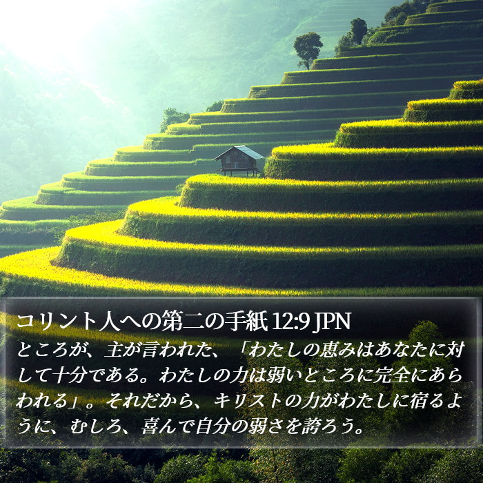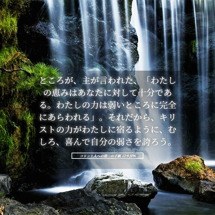 「しかし、主は、『わたしの恵みは、あなたに対して十分である。わたしの力は、弱さのうちに完全に現れるからである』と言われた。それだから、キリストの力がわたしに宿るために、むしろ大いに喜んで自分の弱さを誇ろう。」